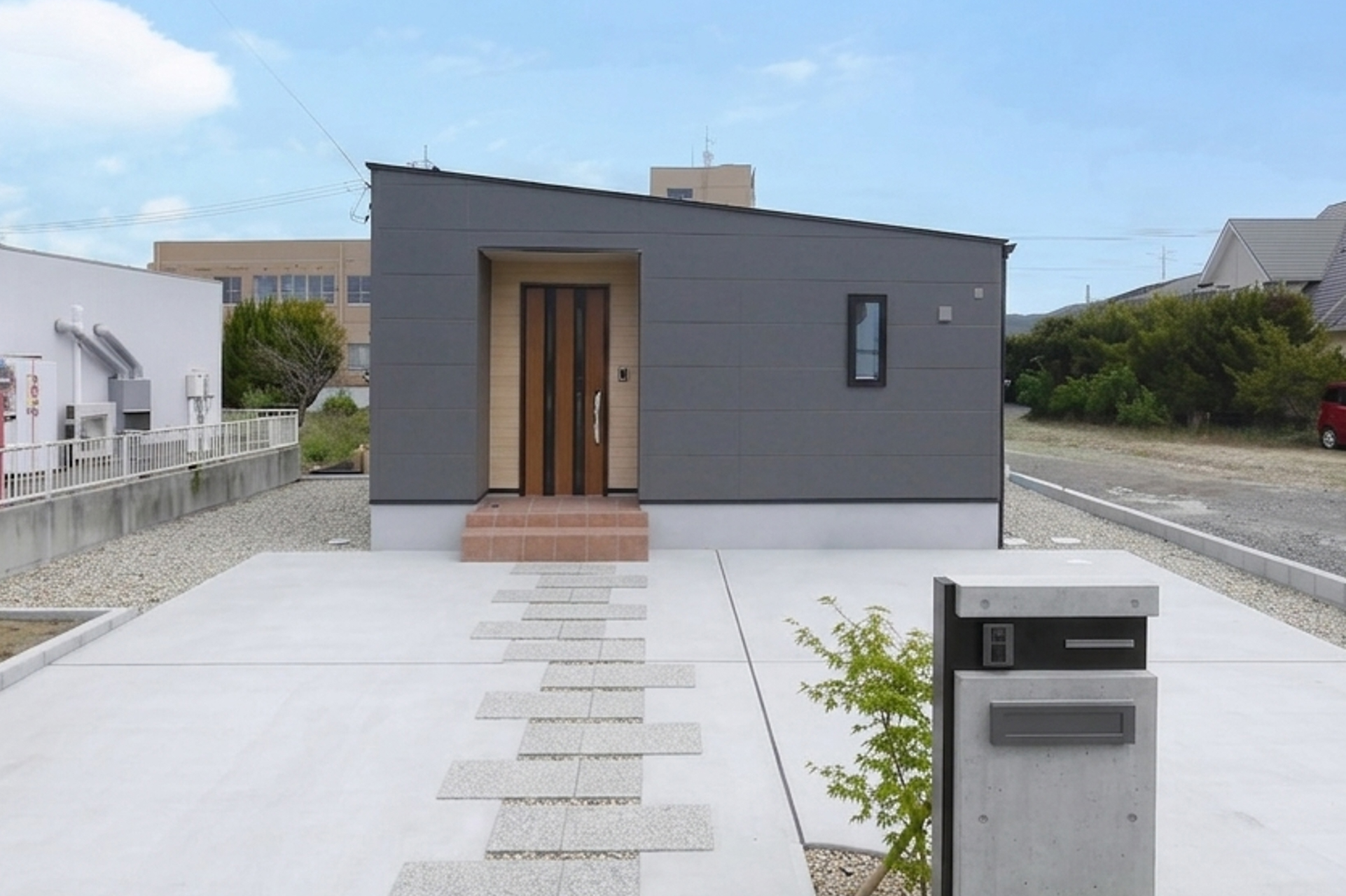 シンプルで無駄のないフォルムが印象的な平屋。 落ち着いた色合いで、街並みに自然となじむ住まいです。 ※外構はイメージです。