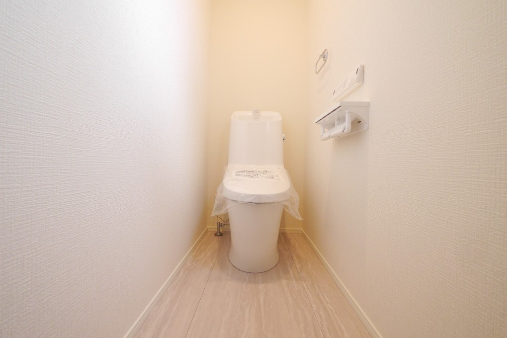 シンプルで清潔感のあるトイレ。 無駄のない設計で、落ち着いて使える空間に整えています。
